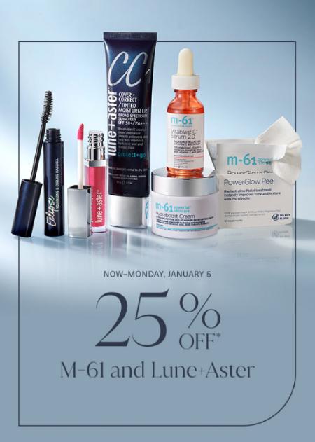 Receive 25% off M-61 and Lune+Aster purchases between Thursday, January 1, and Monday, January 5, 2026. Offer cannot be combined with any other coupons, discounts, promotions, or offers, redeemed for cash, or used for prior purchases. Offer not valid on spa services.