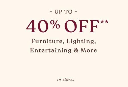 Shop in store and take up to 40% off on furniture, lighting, entertaining & more for a limited time.